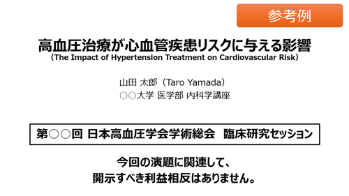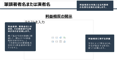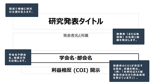 - タイトルマスタ:発表者名、所属、利益相反(COI)表示を明確に。