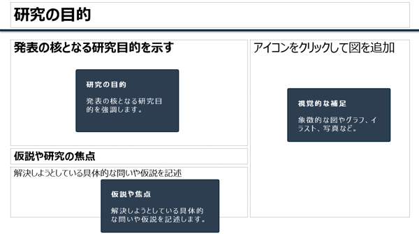 発表の核となる研究目的を短く明確に表現し、仮説や研究の焦点を分かりやすく記載し、聴衆の興味を引きつけます。視覚補助として、関連するアイコンや図を適切に配置するマスタもご用意。